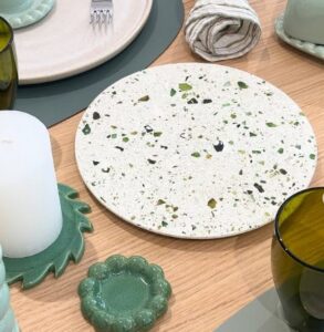 Plongez dans l’élégance durable avec nos Dessous de plat en Verrazzo, créations artisanales de Re-Verre. Chaque pièce, d’un diamètre de 20 cm et d’une épaisseur de 0,8 à 1 cm, combine un mélange minéral et des fragments de verre recyclé dans des nuances uniques : le Mix Vert pour une touche naturelle et le Mix+ Bleu pour une note fraîche et contemporaine.